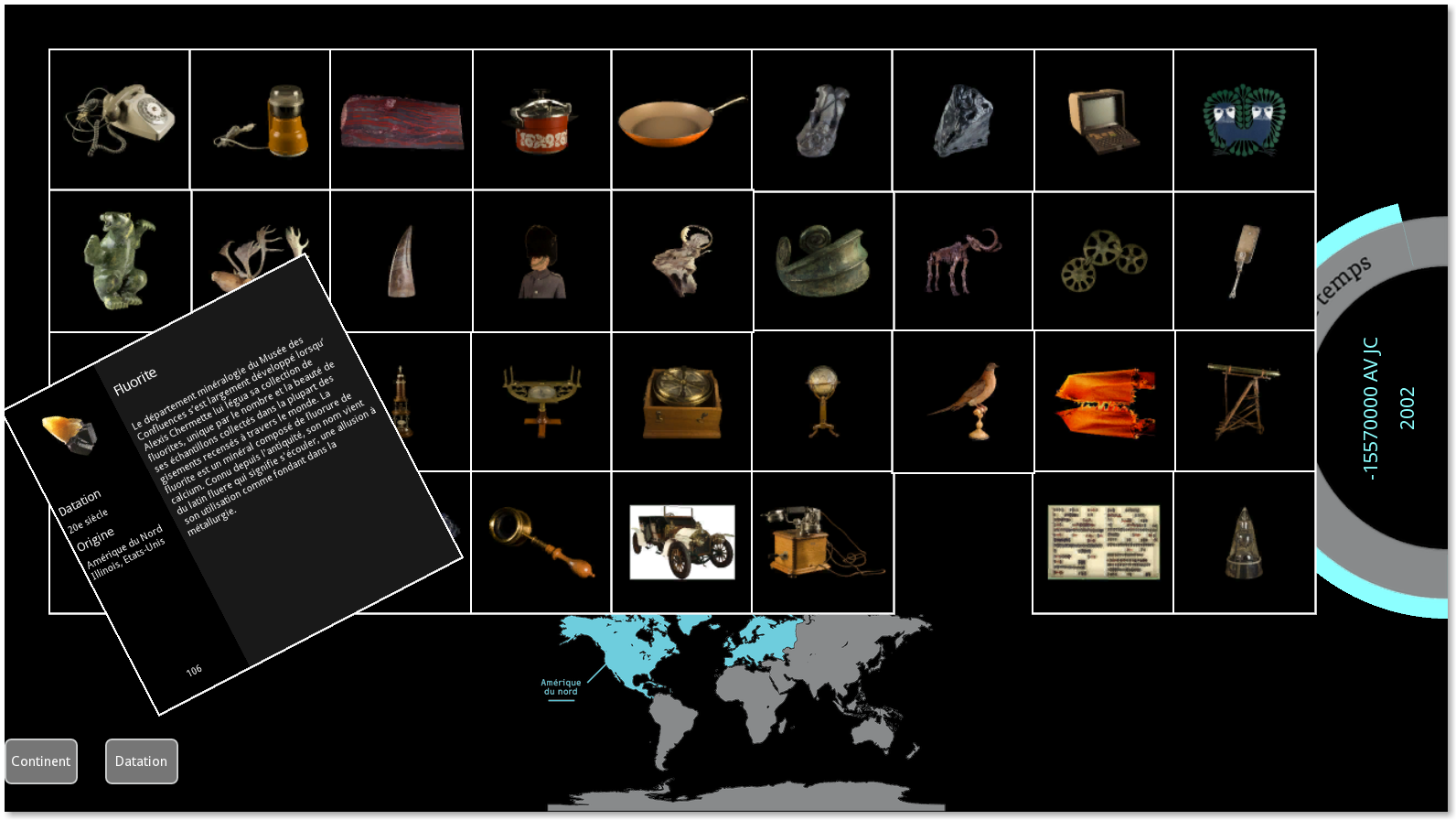 Le point de départ était les travaux d’Erasme sur le Multitouch qui montraient qu’il était possible de travailler sur des archétypes d’interactions multiutilisateurs réutilisables dans des contextes différents. Or tous les musées partagent la problématique de présenter au public leurs collections, souvent par autour des mêmes critères : chronologies, emplacement géographique, catégories et mots clefs, taille de l’objet.